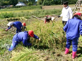 1年生は鳥よけの設置作業を、5年生は稲刈りを行いました。どの学年も